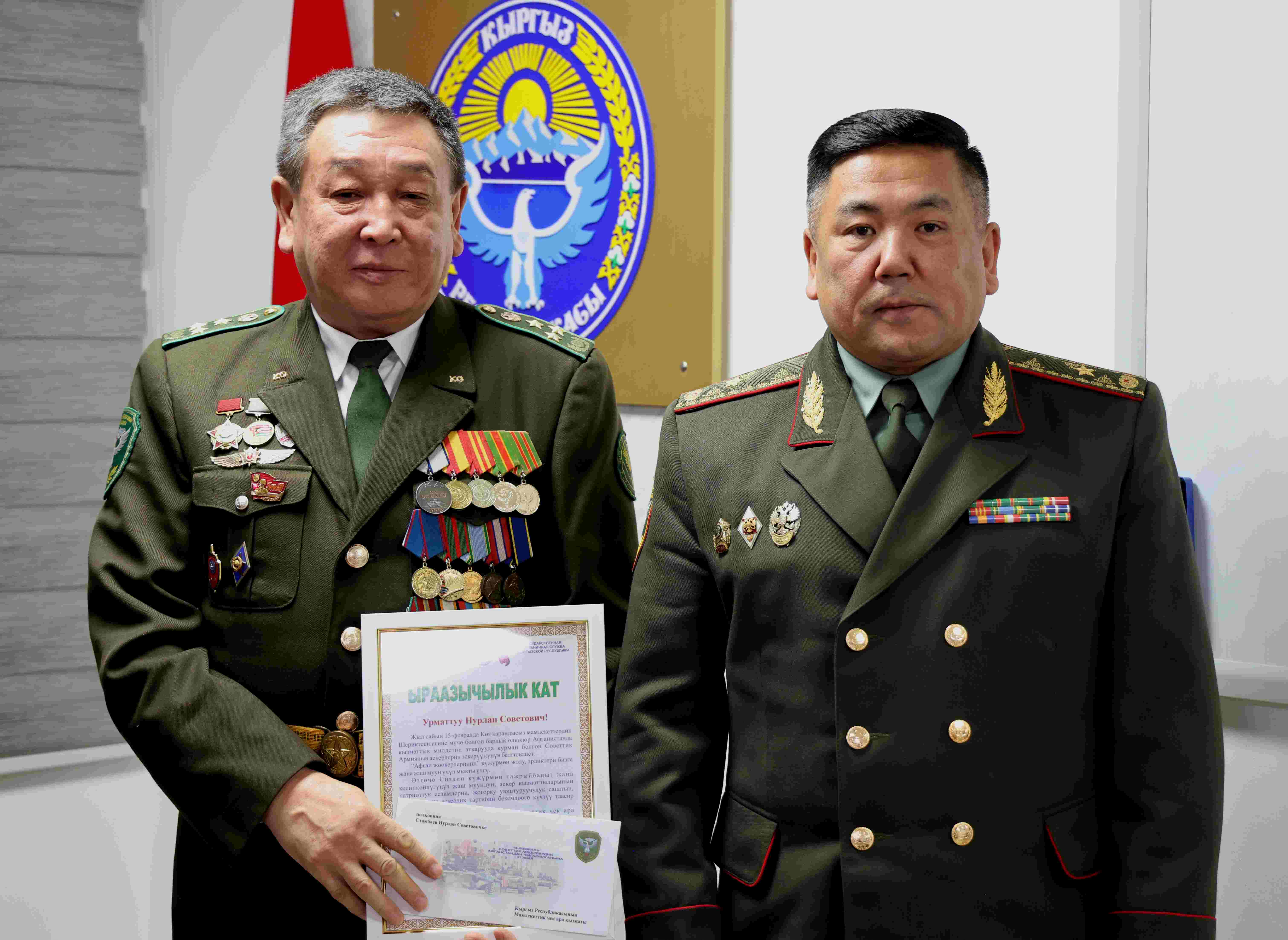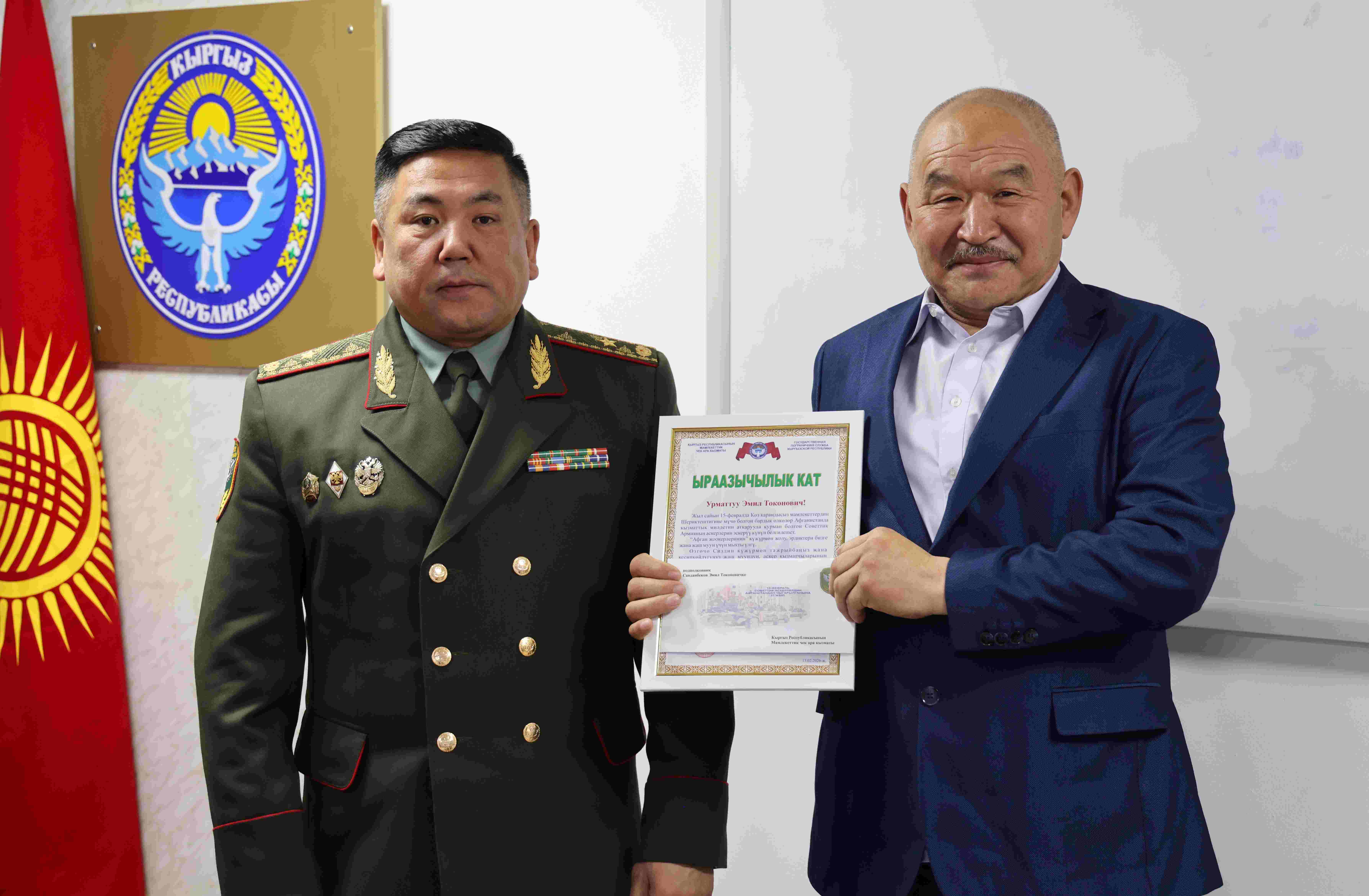 Выступая перед участниками торжественного собрания, председатель Государственной пограничной службы Кыргызской Республики генерал-майор Абдикарим Алимбаев отметил: «Подвиг воинов-интернационалистов навсегда вписан в историю. Вы с честью выполнили свой воинский долг, проявив мужество, стойкость и верность присяге. Для молодого поколения пограничников ваш жизненный путь является примером преданности Отечеству, силы духа и товарищества. Мы глубоко ценим ваш вклад в обеспечение безопасности государства и сохранение воинских традиций».